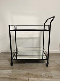 Carrellino portavivande di design, nero, con vetro sopra e specchio sul fondo, tenuto in maniera maniacale. Splendido elemento di arredo, con un po’ di bottiglie di whisky e di gin fa fare un figurone a tutta la casa.