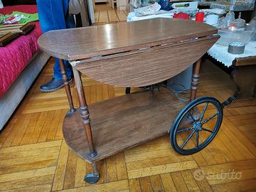 Elegante carrello servitore vintage in legno, anni '50-'70, con piano superiore apribile ovale (drop-leaf) e ruote girevoli per facile spostamento. Ideale come tea trolley, bar cart o complemento d'arredo retrò! Presenta graffi e segni di usura sul legno dei piani, visibili come strisce chiare sul piano superiore e inferiore. Piano pieghevole funzionante, ruote solide senza gravi danni, pronto all'uso o per restauro shabby chic.
