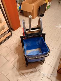 Carrello di pulizia con due secchi e strizzatore a pressa.