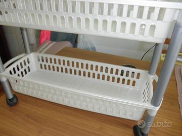 CARRELLO STRETTO CON RUOTE bianco e argento, composto da 3 cestelli bianchi impilabili, 8 staffe argento e 4 staffe con ruote), VENDO CAUSA INUTILIZZO. Come nuovo. Dim cm 57x19x67,5 altezza. Varie possibilità di utilizzo: in cucina come dispensa, in bagno, in lavanderia, come portaoggetti nello studio, ecc… Facilmente riposizionabile grazie alle ruote piroettanti.