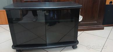 CARRELLO PORTA TV NERO CON PORTELLINE DI VETRO E CON ROTELLE.