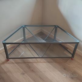 Carrello trapezoidale per TV in ferro verniciato grigio e vetro. Dimensioni: larghezza 113cm profondità 47,5cm altezza 42cm In ottime condizioni