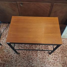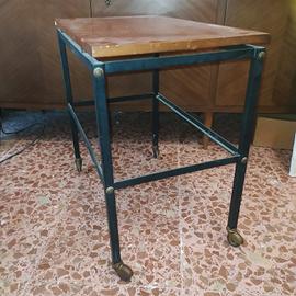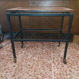 Vendo carrellino vintage originale, ideale per arredamenti in stile modernariato o industriale. Il mobile è composto da una solida struttura in metallo verniciato nero e un ripiano superiore in legno dalle tonalità calde.