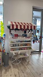 Vendo carretto espositivo di fattura totalmente artigianale, interamente realizzato in legno e dipinto a mano, tenda realizzata appositamente da sarta, puo essere adoperato come espositore per svariate tipologie di merce o come oggetto da sceneggiatura per eventi, fiere o dimostrazioni… di bellissimo impattone richiama molta attenzione! Viene venduto comprensivo ci 20 e piu bocce di vetro per mettere caramelle o qualsivoglia tipo di merce al loro interno! Prezzo affare