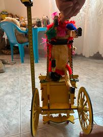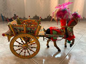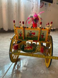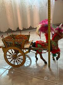 Vendo antico carretto siciliano in legno con cavallo da collezione realizzato a mano lunghezza 47cm, larghezza 20cm, altezza 25cm senza piume