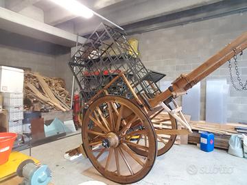 Vendo carro per vavalli in rovere completamente restaurato. il carro misura 4,70 mt e il diametro delle ruote sono 1,60 mt. Nelle foto si vede una gabbia usata per rievocazioni storiche ,ora smontata. Ottimo anche come arredamento negozio o agriturismo