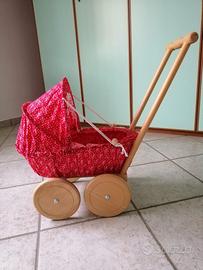 Carrozzina in legno e metallo, con cappottina, materassino e cuscino in cotone. Nuova, mai usata.