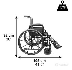 Principali punti in evidenza Marchio PEPE Mobility Colore Nero Peso articolo 17,5 Chilogrammi Stile moderno Dimensioni del prodotto 105P x 64l x 105H cm Materiale Lega di acciaio FACILE DA AUTOSPINGERE: Sedia a rotelle autospinta con grandi ruote posteriori che permettono all’utente di muoversi da solo o con l’aiuto di un accompagnatore tramite le maniglie. Ideale come carrozzina per disabili e anziani con sufficiente autonomia per spostarsi in sicurezza. RESISTENTE E STABILE: Telaio in acciaio robusto e ruote anteriori in poliuretano solido di grande diametro per una migliore stabilità. La sedia include una chiave per serrare le ruote se si allentano con l’uso. Le ruote posteriori con battistrada scolpito migliorano l’aderenza ed evitano scivolamenti. PIEGHEVOLE E FACILE DA TRASPORTARE: I braccioli ribaltabili facilitano il trasferimento laterale dell’utente. I poggiapiedi sono rimovibili e regolabili in altezza e il sistema di chiusura rapida consente di piegare la carrozzina in pochi secondi. Una volta chiusa (29 x 80 x 92 cm) occupa poco spazio e si ripone facilmente nel bagagliaio o in casa. COMODA PER L’USO QUOTIDIANO: I braccioli imbottiti offrono maggiore comfort durante l’uso prolungato e la tasca posteriore è pratica per riporre piccoli oggetti personali. La leva di sollevamento sulle ruote posteriori aiuta a superare in sicurezza cordoli o soglie. Altezza della seduta: 48 cm. MAGGIORE SICUREZZA: Il sistema di bloccaggio dei freni si attiva premendo la leva anteriore e immobilizza completamente la carrozzina. La struttura in acciaio aumenta la resistenza e la cintura di sicurezza fornisce un sostegno aggiuntivo all’utente. Peso massimo utente: 113 kg.