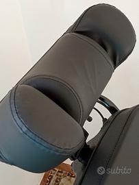 È dotato di cuscino appoggia testa, cuscino schienale e cuscino per polpacci regolabile. Comodi braccioli.