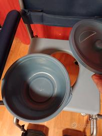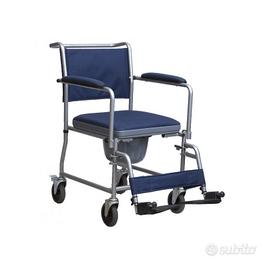 Sedia comoda MAI USATA realizzata in tubolare di acciaio verniciato in colore grigio. Rivestimento in nylon di colore blu facilmente lavabile. La base di questo modello può essere smontata e piegata per essere trasportata con maggiore facilità o comodamente riposta quando non viene utilizzata. Sedile con apertura centrale per l’igiene e coprisedile imbottito. Corredata di secchio estraibile con coperchio. Caratteristiche tecniche Dimensioni seduta: Larghezza: 44 cm profondità 44 cm Altezza da terra a sopra il sedile: 52 cm Altezza da terra a sopra la struttura che sostiene il sedile: 45 cm Dimensioni esterne: 61 cm larghezza x 69 cm profondità senza pedane x 96-105 cm altezza Portata massima: 110 Kg