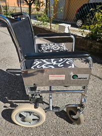 comoda carrozzina con ruote piccole per girare in casa completa di cuscino antidecupito e pedali per appoggio piedi estraibili