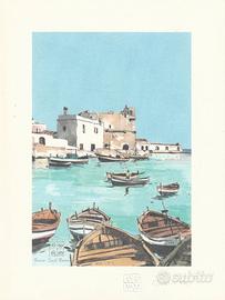 BIOGRAFIA DELL'AUTORE Aldo Riso nasce nel 1927 a Santa Mariadi Leuca, nella provincia di Lecce. Si applica negli studi fino al perseguimento della laurea in Giurisprudenza, ma parallelamente approfondisce, sin da giovanissimo, la conoscenza delle tecniche pittoriche, prediligendo la tecnica dell’acquerello per ritrarre i famosi scorci della sua Puglia e più ingenerale dell’Italia meridionale. Tiene la sua prima mostra nel 1956. Il suo immaginario artistico lo consacra a un notevole successo di mercato che lo porta a esporre oltre che in Italia anche in Germania, Austria, Francia, Grecia, Serbia, Spagna, Canada, Stai Uniti, Messico, Argentina e Sud Africa. Nei primi anni Settanta viene invitato a realizzare una grande opera murale a Ustica e l’amore per quest’isola lo accompagnerà per tutta la vita. La sua ricerca si caratterizza per una pittura chiara, intensa, solare, ove i paesaggi sono inondati dalla luce che solo l’acquerello può rendere nelle sue tipiche trasparenze. Case, barche e pescatori respirano rarefatti e sospesi sotto cieli implacabili e davanti a mari cristallini. Al suo lavoro si interessano importanti firme della critica e famosi personaggi della cultura e dello spettacolo. Le sue opere sono presenti in numerose collezioni pubbliche e private. Aldo Riso muore a Roma nel 2008