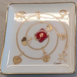 Descrizione:Coppia originale Cartier anni ’90, svuotatasche 12 x 12 cm in porcellana con bordo oro e decorazione a catena con charm iconici. Firma frontale, oggetti boutique vintage, non riproduzioni. Perfetti come complemento d’arredo, porta gioielli o regalo di lusso. Condizioni ottime, pronti per spedizione immediata. Eccellente regalo per la festa della donna, in arrivo.