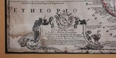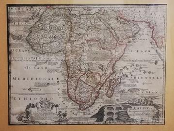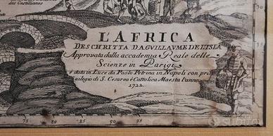 In perfette condizioni e completa di cornice, cartina geografica dellAfrica, approvata dall' accademia reale delle scienze in Parigi, data in luce da Paolo Petrina Con privilegio di S.Cesarea è Cattolica Maesta dedicata all'altezza serenissima F.D. Antonio Manuel de villena gran maestro della religione gerosolimitana Principe di Malta Gozo e Tripoli. La cartina senza cornice misura cm58x45, con la cornice cm74x60