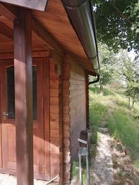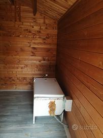 Casetta da giardino in kegno spessore 45 mm. 2.5x3.5 m con veranda di 1.5x2.5 m con aggiunta di tegole, impianto elettrico già predisposto. Presenza di un contenitore coibentato per insonorizzare eventuale Generatore di corrente