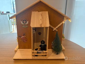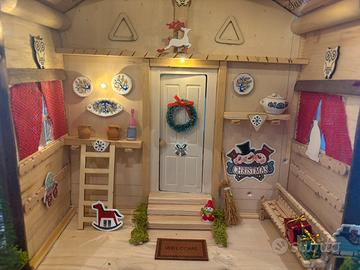 Struttura in legno con tantissimi dettagli curati: alberelli, panchina con pacchetti regalo, zerbino “Welcome”, decorazioni di Natale, mensole con piattini e vasetti, finestre con tende e fioriere, stendino con panni, piccolo omino sul retro e molto altro.