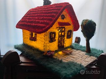 Una piccola casetta all’uncinetto che si illumina dall’interno, diffondendo una luce calda e avvolgente. Le trame del filato lasciano filtrare bagliori soffusi, creando un’atmosfera intima e accogliente, dal fascino delicatamente artigianale .