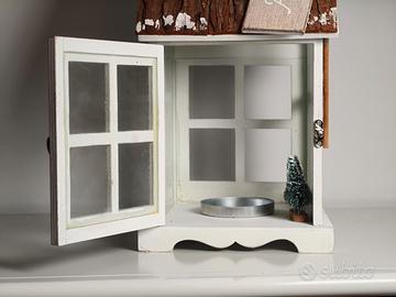 Realizzata in legno con dettagli curati: tetto in corteccia, finestre in vetro, targhetta “Auguri”, fiocco in stoffa e piccolo allestimento interno con alberelli decorativi.