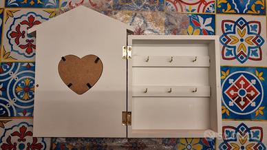 Casetta porta chiavi in legno nuova, realizzata in legno bianca, con due gancetti sul retro per poter essere appesa.