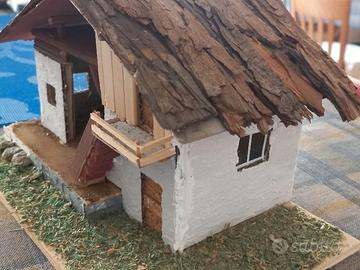 Realizzata interamente a mano: base e struttura in legno, tetto in cartoncino e corteccia, pareti in cartoncino stuccato e legno.