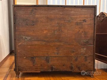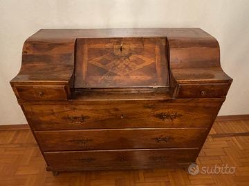 bureau secretaire a ribalta cilindrica italiano (Emilia o Veneto), in noce massello , ribalta . Struttura con 4 ampi cassetti frontali, due cassettini laterali superiori, piano interno da lavoro apribile, piedi torniti e lati curvi; schiena in tavolame originale.