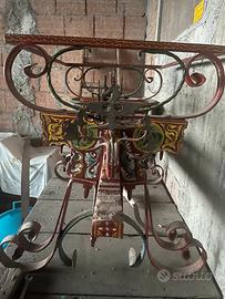 Vendesi splendido ed autentico Brancale (struttura portante) di un antico carretto siciliano. Il pezzo è un esempio magistrale di artigianato tradizionale, caratterizzato da: • Decorazioni: Intagli e pitture originali con motivi floreali, figure mitologiche e il classico simbolo della Trinacria. • Materiali: Legno scolpito e raffinati inserti in ferro battuto lavorato a mano con silhouette di cavalieri e cavalli. • Firma: Riporta chiaramente la dicitura "Ravalli Antonio - Niscemi", a testimonianza della provenienza e della firma d'autore. • Stato: Ottime condizioni vintage, con patina originale che ne esalta il valore storico. Perfetto come elemento d'arredo per interni di pregio, loft, ristoranti tipici o per collezionisti di arte popolare siciliana. Può essere trasformato in una base per un tavolo in vetro o esposto come opera d'arte.