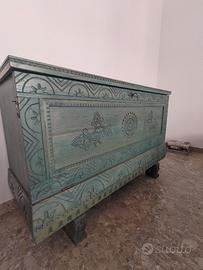 Cassa panca Sarda turchese, con apertura centrale. L.135xP.45xH.83