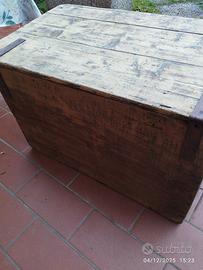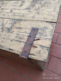 Cassa vintage cm 99 x cm 58,5 altezza totale cm 58. La cassa è di fine 800. Tutti i fianchi e il fondo sono realizzati con una unica tavola. Baule in legno rustico
