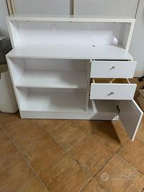 Cassa per parrucchiere con due cassetti, un vano con sportello e un ripiano a giorno, frontale in similpelle lavorata con swarovski. + postazione lavoro 2 posti con piano in travertino con mobile + 3 poltrone tutto perfetto .Disponibilità immediata