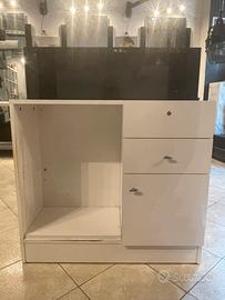 Mobile cassa MARION 100 construttura in nobilitato con 2 cassetti, sportello e ripiani a giorno. Alzata pannello in laminato. (100x39x110h)-strutt. Bianca pannello nero (un pó rovinata la parte sotto dove siappoggiano i piedi)
