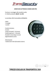 INSERZIONE N°: S.01 Contattateci direttamente con un semplice messaggio whatsapp al daremo risposta a tutte le vostre richieste. Noi di Trans Security Service S.N.C. siamo un'azienda di Verona che dal 1988 si occupa di vendita e noleggio casseforti. Cercate nel web "Trans Security Service S.N.C." troverete molti altri modelli di casseforti e armadi. I nostri prodotti sono prodotti usati e noi li ripristiniamo direttamente mantenendo intatte le caratteristiche di sicurezza,di funzionamento e relative certificazioni, consentendo così al cliente la libertà di personalizzare il prodotto(colore e allestimento). Modello cassaforte: Cassaforte C3 Marca: Conforti Colore RAL interno/esterno: RAL 7038 (Grigio chiaro) *Colore a scelta tra i colori Ral inseriti nell'offerta (1013, 1015, 5014, 6020, 6021, 7001, 7015, 7016, 7022, 7030, 7035, 7038, 7040, 7047, 9010, 9005, 9006 senza variazione di prezzo) Dimensioni esterne: H. 500 L.600 P.400+ 40mm Dimensioni interne:H. 400 L. 480 P. 230 mm Peso: 180 Kg N° ripiani: 1 2 fori per ancoraggio: sulla schiena e sulla base della cassaforte . Serratura a chiave: Duplice esemplare Combinazione: Meccanica 3 dischi *Combinazione Elettronica su richiesta, comporta variazione di prezzo. E' possibile ritirare direttamente la cassaforte in azienda o richiedere preventivo per trasporto e istallazione.. Non è garantita la disponibilità immediata, ma potrebbero essere richiesti 4/5 gg lavorativi. Per Info: mail o telefono (sms\WhatsApp) Facendo riferimento al numero dell'inserzione , in questo caso "INSERZIONE N°: S.01".