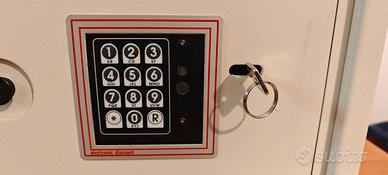 Cassaforte da armadio bianca buone condizioni Alt 23 Prof 25 Lung 35. Divisorio interno estraibile. Alimentazione pila 9V. + chiave di emergenza. Euro 30 Andrea.