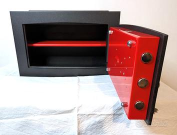 Struttura robusta in acciaio, porta rinforzata interna rossa, chiusura a chiave con perni frontali e ripiano interno. Predisposta per incasso a muro, ideale per casa o ufficio.