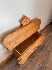 In vendita cassapanca in legno di abete massello, finemente decorata a mano con motivi eleganti e ricercati.
