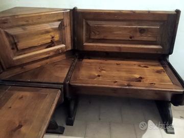 cassapanca angolare in legno massello di cm: 177x 132 profondità cm 50. Legno massello, tenuta bene con qualche segno del tempo, bella. con 3 sedie abbinate , stesso materiale.