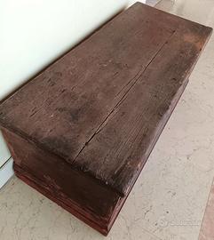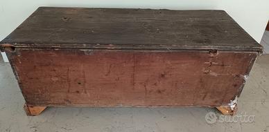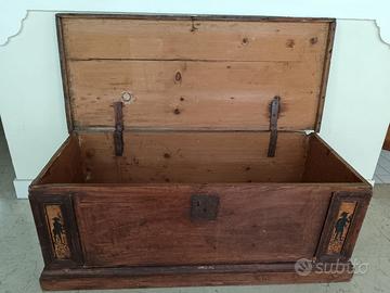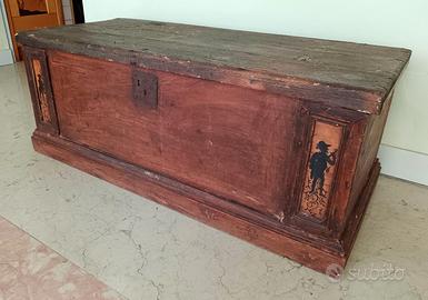 Vendo a poco, cassapanca porta legna di metà 1700, in legno, di manifattura veneta. Spaziosa cassapanca in legno della metà del 1800, decorata con sagome nere di giullare, di gusto storicistico. Ogni componente è originale. Il coperchio è da fissare.