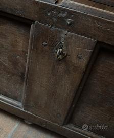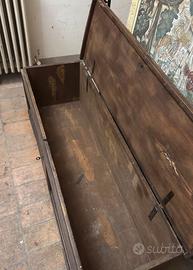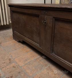 Vendesi splendida cassapanca antica in legno di noce massello, risalente alla fine del XVII / inizio del XVIII secolo. Il mobile è un pezzo autentico d'antiquariato, caratterizzato da una linea sobria ed elegante, tipica della produzione artigianale italiana del periodo barocco. Caratteristiche principali: Materiale: Pregiato legno di noce con splendida venatura a vista sul piano e sui pannelli. Struttura: Fronte a tre pannelli riquadrati con formella centrale sporgente. Piedi a mensola sagomati a voluta. Dettagli: Serratura e chiave d'epoca presenti. Cerniere interne a nastro originali fissate a mano. Stato: Il mobile è integro e solido. Presenta una bellissima patina del tempo; necessita di un leggero restauro conservativo e trattamento antitarlo precauzionale per tornar al suo massimo splendore. Dimensioni: Larghezza: 152 cm Profondità: 48 cm Altezza: 54 cm Pezzo ideale per ingressi, saloni classici o come fondo letto di prestigio.