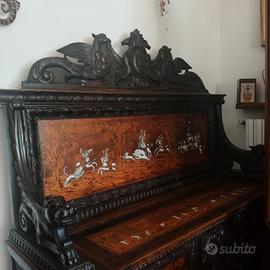Antica e pregiata cassapanca con spalliera in noce intagliata ed intarsiata in osso , bosso e noce con motivi raffiguranti scene di caccia .