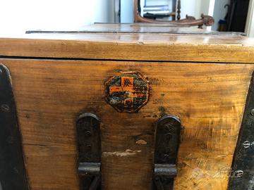 Cassapanca in legno con dettagli in ferro. Chiusura d'epoca originale Inserto interno con lista rifornimenti in epoca di guerra Dettaglio Croce laterale Misure: 47 128 55 aperta h 1.02