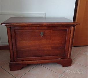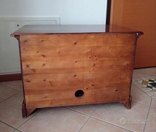 Vendo cassapanca in legno massello arte povera misure L 80 x P 45 x H 57 cm. 2 maniglioni laterali in ferro battuto. Anta anteriore con serratura e 1 ripiano interno. Foro posteriore per passare eventuali cavi cd /dvd. Made in italy. In perfette condizioni. Non spedisco.