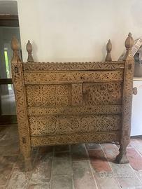 vendo bellissima cassapanca in legno del XIX secolo proveniente dall’afghanistan. Ha un’apertura superiore e una laterale sul fronte. È molto decorata con bellissime incisioni. presenta segni di usura