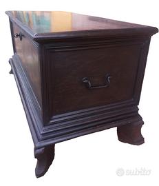 Austera ed imponente cassapanca barocca piemontese, interamente realizzata in assi uniche di noce massello di notevole spessore, risalente alla prima metà del XVII secolo e costruita in ambito padano.