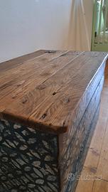 cassapanchina completamente realizzata a mano e con legni di recupero di pallet , rifinita con vernici di qualità e decorazione unica fatta con la tecnica stencil e gesso .