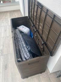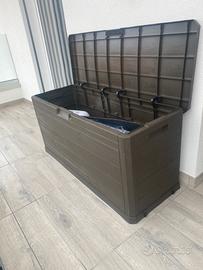 Cassapanca baule in plastica marrone effetto legno, con rotelle laterali.