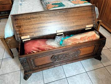 Cassapanca vintage in legno lavorata a mano in ottime condizioni, molto capiente. Misure: larghezza 130 cm, altezza 49 cm e profondità 42 cm.