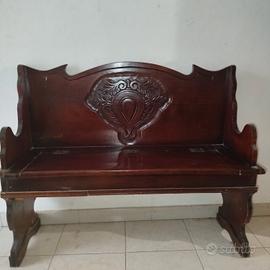 Cassapanca, panchina con scomparto anni 70, legno massiccio scuro e lucido con incisioni anni 70 e fatto a mano, dimensione 80 di altezza x 100 larghezza