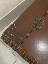 Cassapanca con instarsi in stile classico in legno. Piccola crepatura, non strutturale, riparabile. Dimensioni chiuso: Lunghezza 127 cm Altezza 49 cm Profondità 44 cm Dimensioni aperto: Lunghezza 114 Altezza 37 Profondità 44 Apertura 114 X 25