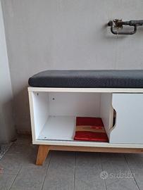 Cassapanca in stile nordico adatta a tutti gli ambienti per uno stile dai colori caldi bianco con piedini in legno massiccio e comodo cuscino di colore grigio.
