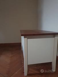Vendo cassapanca solida e funzionale, ideale come contenitore e seduta. Struttura bianca con finitura a doghe e piano superiore color marrone.