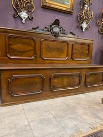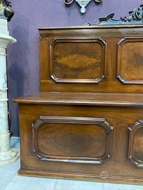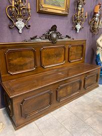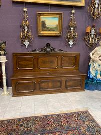 Splendida cassapanca d’epoca Ottocento realizzata in noce di particolare fascino là cimase nella parte della spalliera con lo stemma araldico misura 215x60 ed ha un’altezza di 145cm